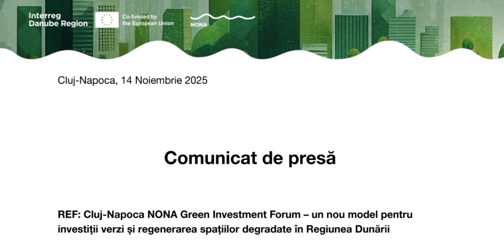 Comunicatul de presă din 14 Noiembrie 2025 se referă la prima ediție a NONA Green Investment Forum de la Cluj-Napoca , un eveniment organizat în cadrul proiectului european NONA – New governance for New spaces , finanțat prin Interreg Danube Region Programme. Forumul a reunit reprezentanți ai administrației publice, mediului academic, sectorului privat, investitori și organizații civice pentru a discuta despre transformarea spațiilor degradate în investiții verzi viabile și a marcat lansarea platformei Green Investment Forum, care are scopul de a pregăti proiecte verzi pentru următoarea perioadă de programare europeană (2028-2034). S-a prezentat Metodologia NONA, un model unitar de planificare a investițiilor verzi structurat în șase faze, orientat către rezultate durabile, incluzive și conforme cu taxonomia europeană , iar un obiectiv cheie a fost conturarea unei agende comune pentru Hub-ul de Investiții Verzi al Regiunii Dunării, cu Cluj-Napoca ca punct de referință.